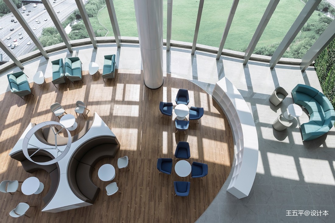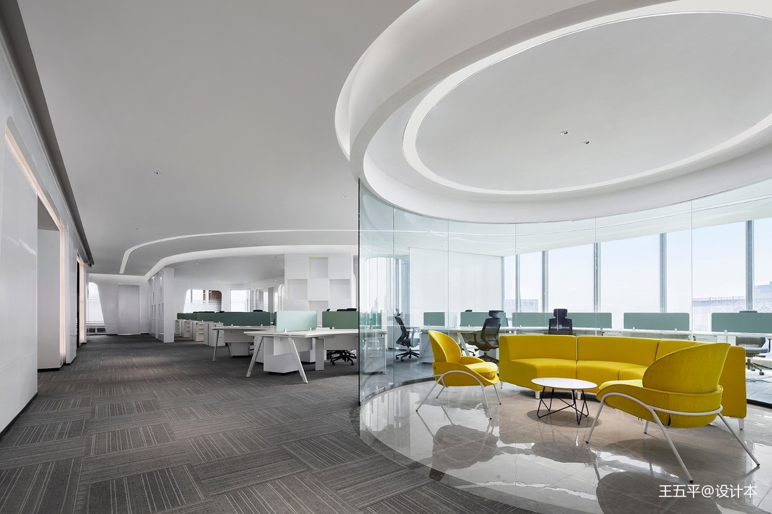 俯瞰空間,光陰交織,線面糅合。曲線元素打破呆板和無趣,賦予空間多變性?;《缺尘熬徑饪臻g突兀感,將空間柔化,并貫穿空間每一個角落。簡單而充滿未來感的燈具,在低調中,卻成為另一亮點,迸發著設計師的創意與靈感。開放式的空間,辦公、洽談或是端詳風景,洋溢著的高端與時尚,溢于言表。